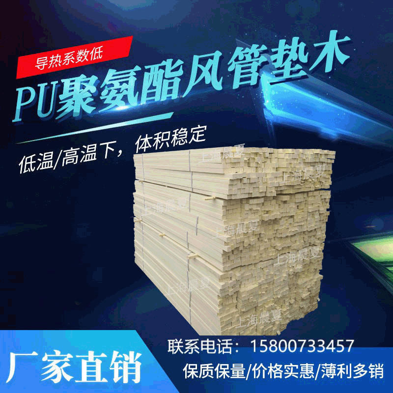 PU聚氨酯风管垫木是由异氰酸酯与聚醚为主原料,再加上发泡剂、触媒和阻燃剂,经高速搅拌混合反应生成的具有塑胶、橡胶和软木特性的发泡聚合体。泡体是由成千上万极微小均匀的单个细胞组成,呈立体蜂窝式的结构。其热传导率低、抗压强度高、吸水率低,有沥青木制品及其他类衬垫物难以比拟的优良性质,是深冷管道管托、鞍座及低温设备垫块的理想材料。在国内及欧美国家用于石油化工基地、LNG液化气厂、冷链基地及中央空调系统之管托、支吊架及垫块等。