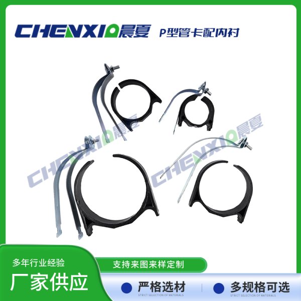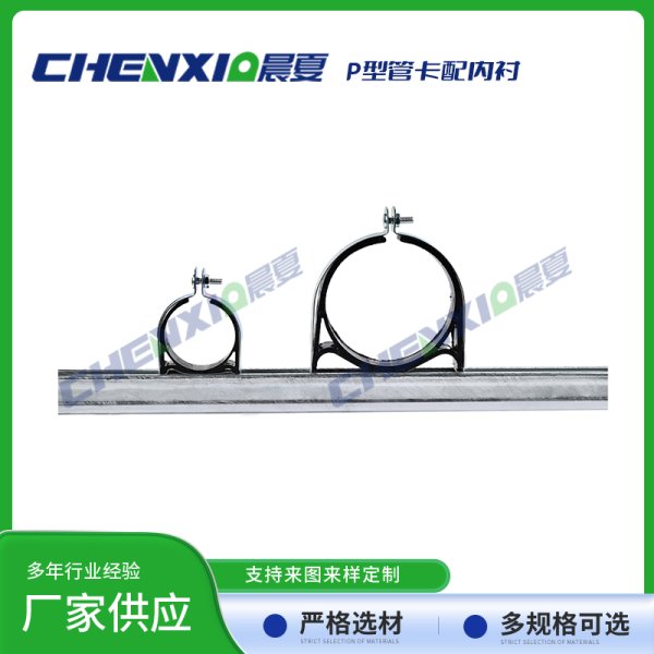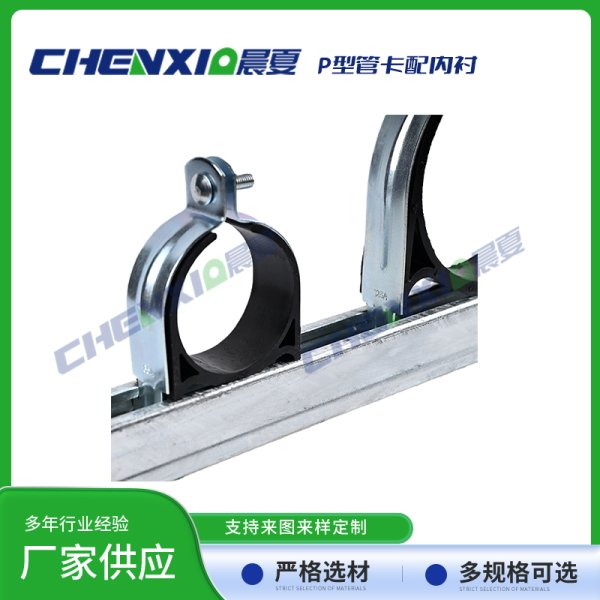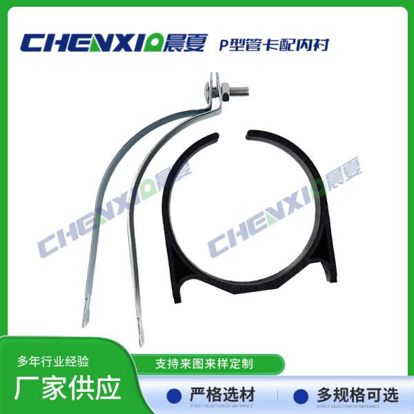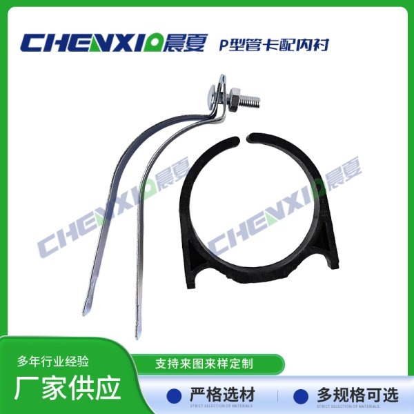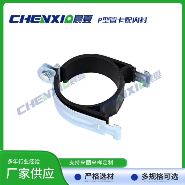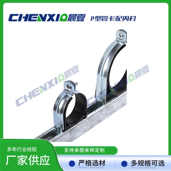 我司P型管卡配绝缘内衬,强度高,韧性好,可塑性强,厚实牢固。全部采用电镀锌处理,防锈耐用,美观实用。Ф273以下规格压有槽纹以增加其强度与刚度,不易回弹。