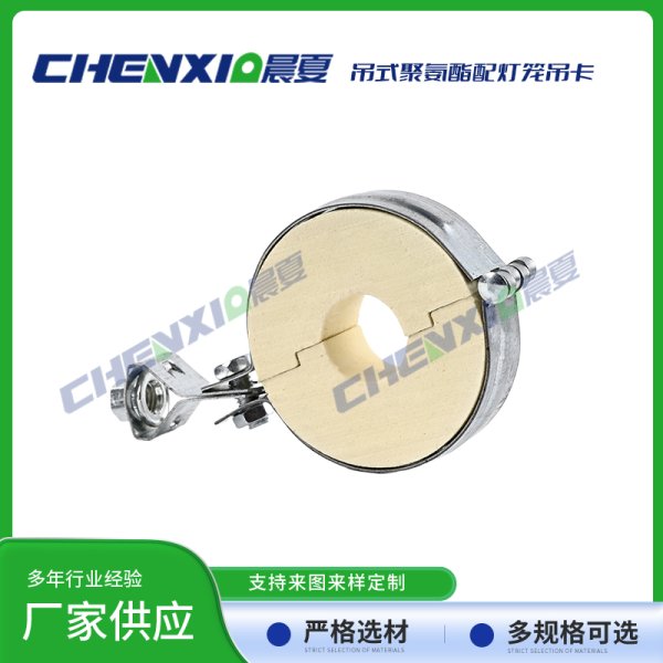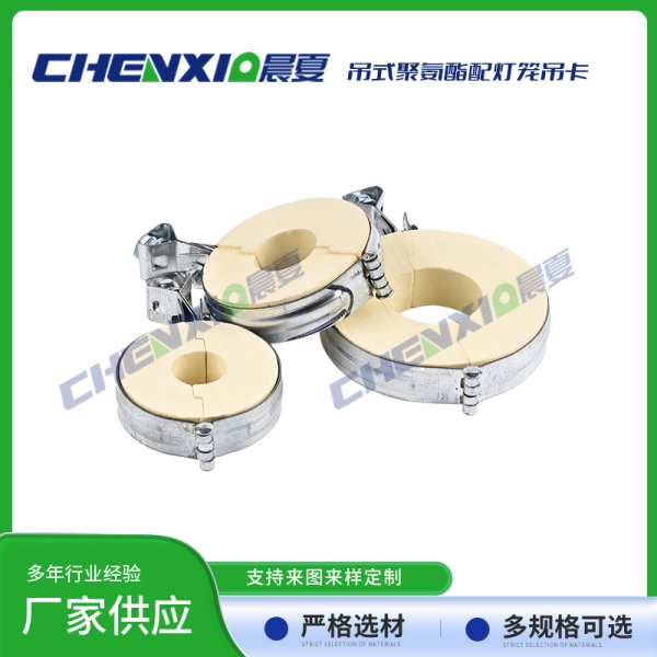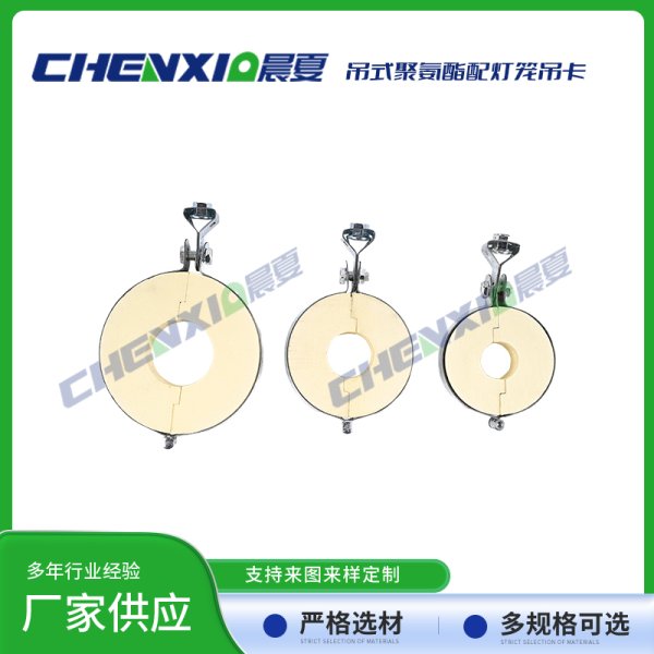吊式PU聚氨酯管托配灯笼抱箍由异氰酸酯与聚醚为主原料,再加上发泡剂、触媒和阻燃剂,经高速搅拌混合反应生成的具有塑胶、橡胶和软木特性的发泡聚合体。泡体是由成千上万极微小均匀的单个细胞组成,呈立体蜂窝式的结构。其热传导率低、抗压强度高、吸水率低,有沥青木制品及其他类衬垫物难以比拟的优良性质,是深冷管道管托、鞍座及低温设备垫块的理想材料。在国内及欧美国家用于石油化工基地、LNG液化气厂、冷链基地及中央空调系统之管托、支吊架及垫块等。