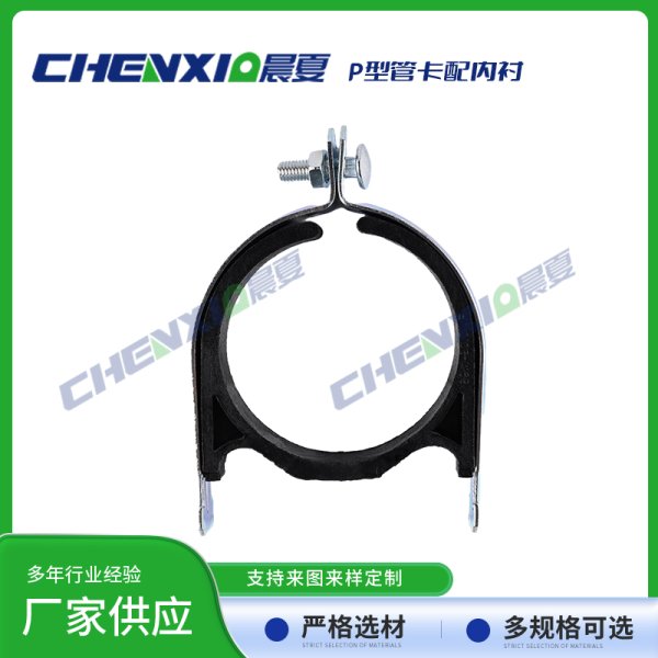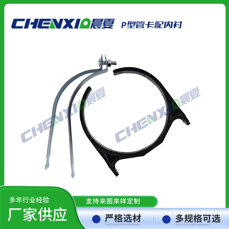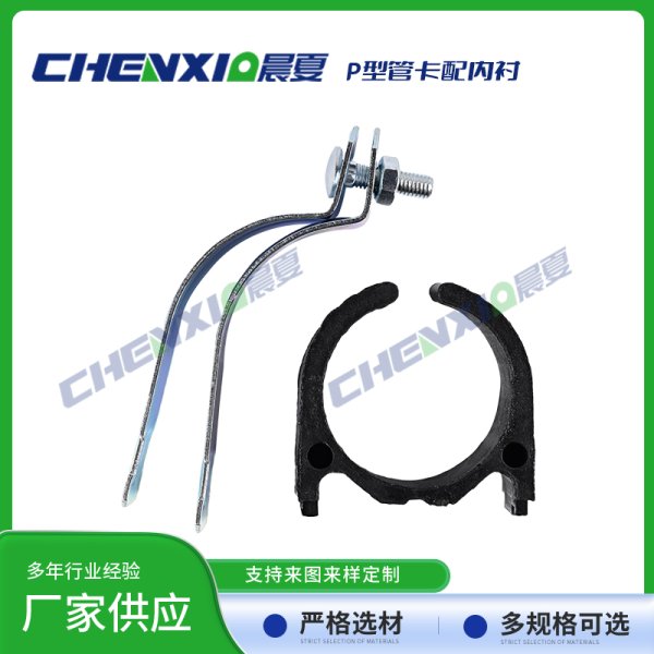 我司P型管卡配绝缘内衬,强度高,韧性好,可塑性强,厚实牢固。全部采用电镀锌处理,防锈耐用,美观实用。Ф273以下规格压有槽纹以增加其强度与刚度,不易回弹。